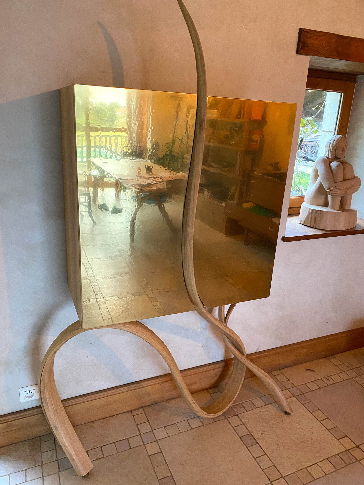 Console en chêne 785 haut x 172x122cm / technique / pied sculpté cintrage vapeur en forme de vague