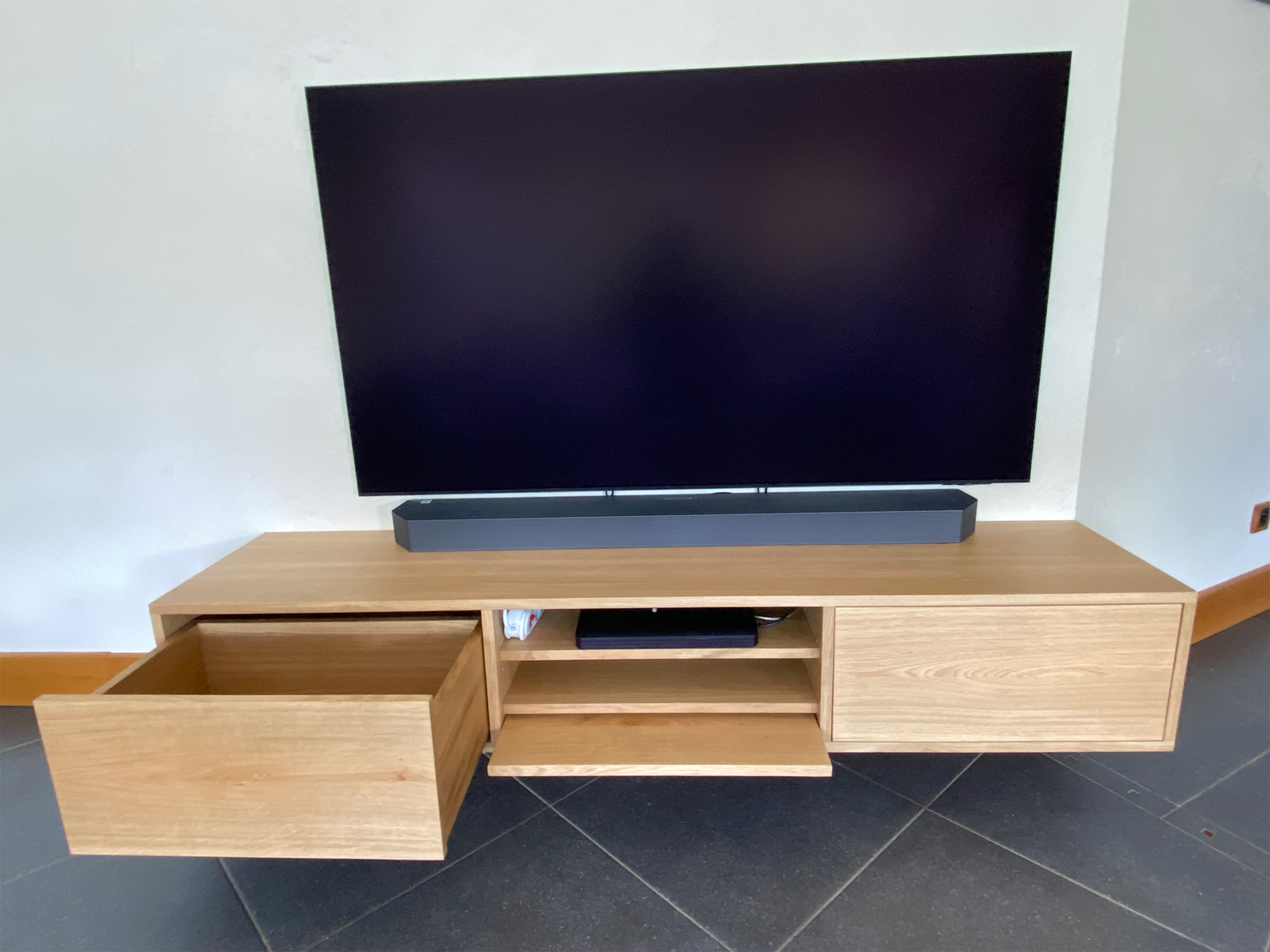 Meuble et étagères suspendues en châtaignier huilé avec luminaire fleur en noyer